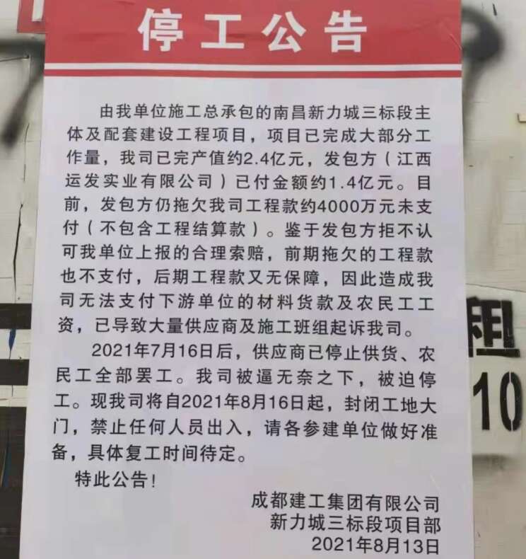 2021年8月,成都建工将一纸停工告示张贴在新力城工地大门外。表示因前期被拖欠工程款,后期工程款也无保障,成都建工被大量供应商和施工班组起诉,被迫停工。成都建工将封闭工地大门,禁止人员出入。