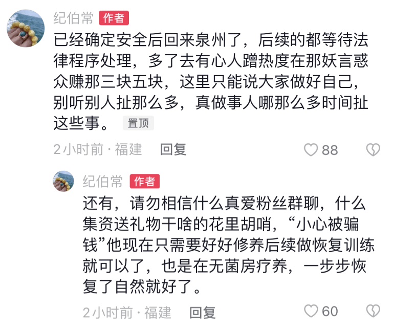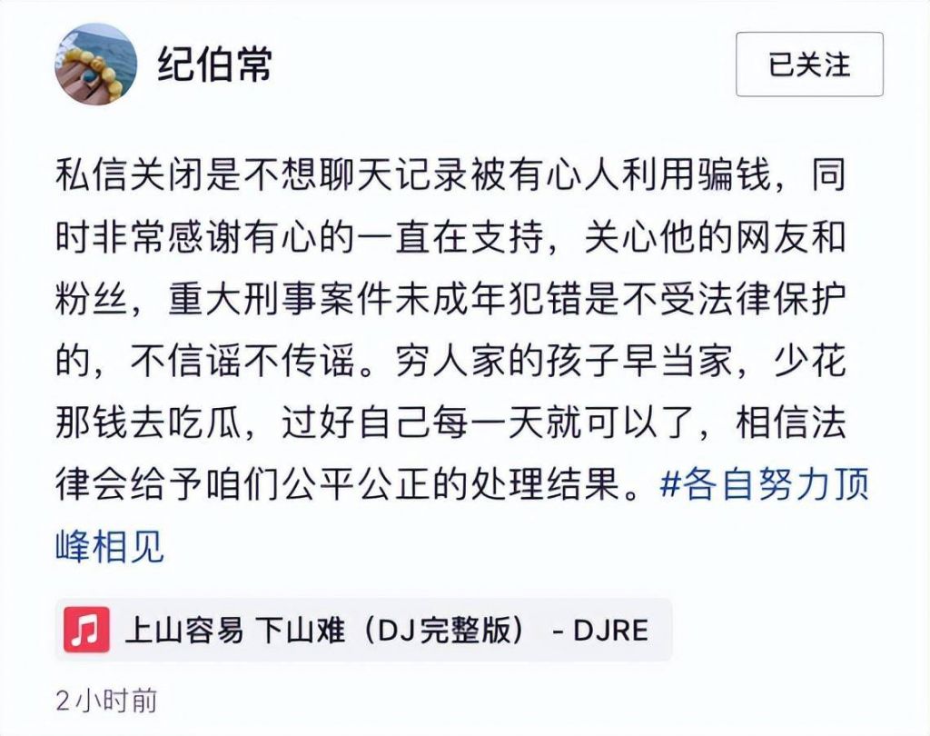 这条动态发布后,石佳明的叔叔27日凌晨再次发声,他直言关闭私信是不想聊天记录被有心人利用骗钱,家人非常感谢一直关心石佳明的粉丝和网友,还告知重大刑事案件未成年犯错是不受保护的,让网友不信谣不传谣。