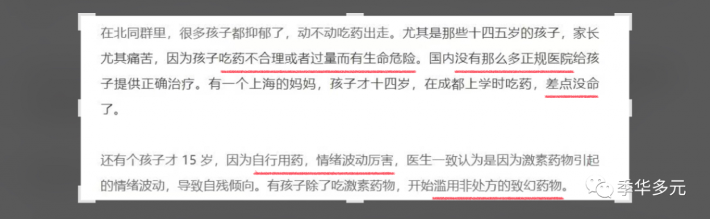 原文故事中所说的涉及未成年人用药问题,丁香医生原推文仅客观讲叙这件故事的经过而已,而并非呼吁其他未成年人或青少年跨性别者去像故事当事人一样去用药。打个比方,难道我们在讲一个故事时提到了抑郁症三个字,就等于是宣传和呼吁其他人学习怎么患抑郁症吗?援引该段文字质疑丁香医生“宣传未成年人‘变性’”是曲解立意、断章取义。