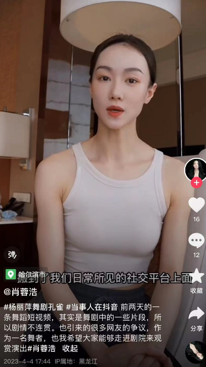 4月4日,肖蓉浩再次发视频回应争议,她表示:前两天的一条舞蹈短视频,其实是舞剧中的一些片段,所以剧情不连贯。引来网友的争议。有一些网友不理解这种肢体接触,可能是因为我们把舞台上的艺术,搬到了日常社交平台上,近距离观赏和在舞台上的表演,其实是非常有出入的。希望大家可以到剧院来观看,一定会给你不一样的体验。