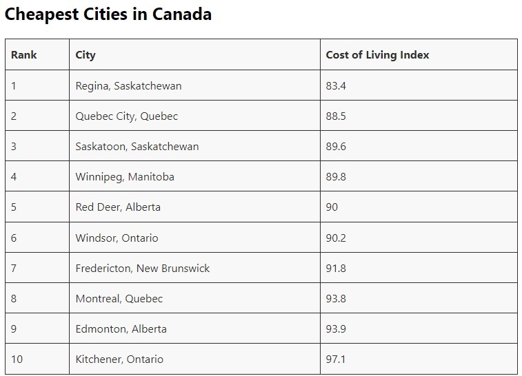 这些城市的生活成本低于加拿大的平均水平,其中最便宜的要属萨省的里贾纳,该指数只有 83.4%,相比加拿大平均100分水平要少 16 分。