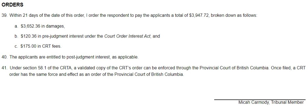 最终,仲裁法庭裁决由卖家支付 C 夫妇相关上述费用,以及利息,和民事法庭费用,总计 $3,947.72。