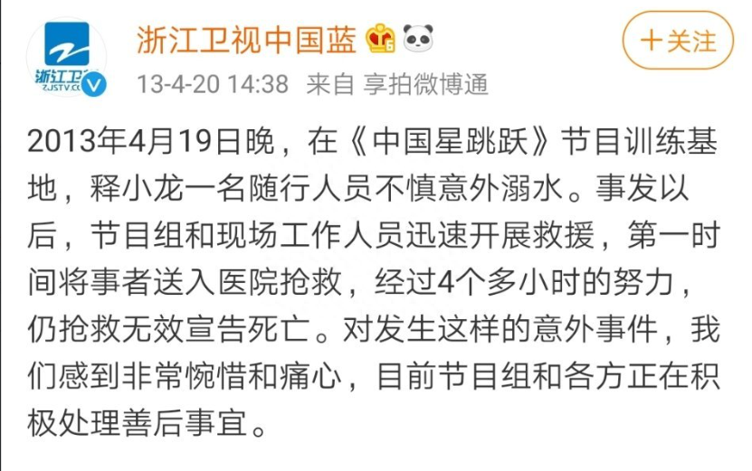 2013年4月,明星释小龙的一名随行人员在浙江卫视一档节目的训练基地溺水身亡,浙江卫视事后发布了一则道歉,表示对此感到非常惋惜和痛心,会积极处理善后事宜。