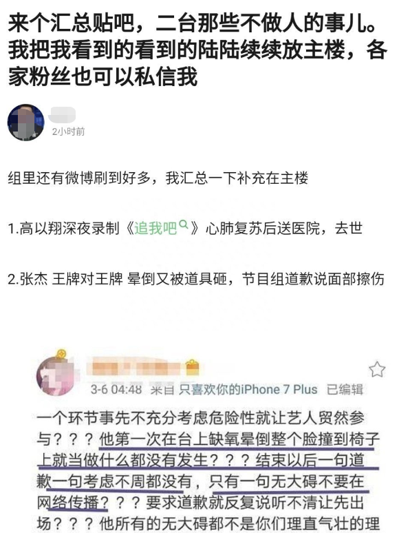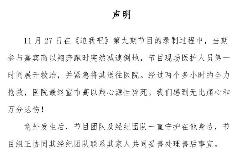 2019年11月,明星高以翔在录制浙江卫视节目《追我吧》过程中心源性猝死,送到医院后抢救无效去世,整件事受到极大关注,节目组同样发布了一则声明,当时就有网友发现,6年时间2条人命,换来的是文案高度相似的两条声明,连抱歉和对不起都看不到。