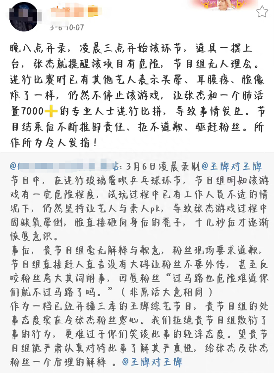——张杰录制节目过程中晕倒,根据现场粉丝反馈,凌晨3点节目组安排明星玩游戏,在张杰事先提出游戏项目有危险的情况下,还是要求继续,最终导致其他艺人头晕、耳膜疼,张杰缺氧晕倒,脸直接砸到了椅子上失去意识。