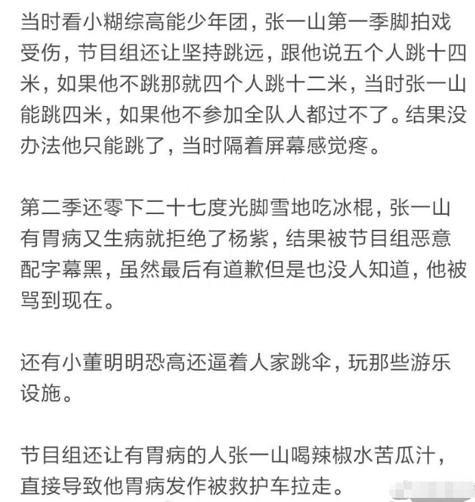 除此之外,还有各家粉丝的控诉——刘昊然、王俊凯满脸被夹夹子、让张一山吃刺激性食物导致胃病复发送医院,让恐高症的董子健去跳伞、让不懂水性赵丽颖下水差点导致溺水、让鹿晗玩游戏导致他旧伤复发送医院。