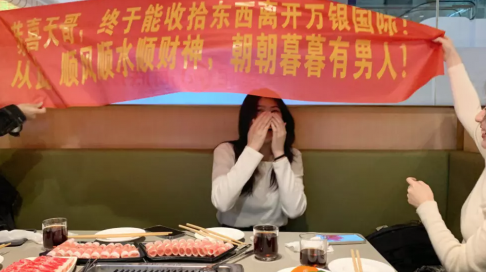 离职不再是愁眉苦脸的事情,而是聚在一起庆祝一下,这种做法引发了法国记者的关注。26日,法国《世界报》驻上海记者西蒙·勒普拉特(Simon Leplatre)发回报道说,一名22岁的奔驰汽车公司部门管理辞职后,没有选择静悄悄地离开,而是和朋友们聚在一起庆祝了一番。照片上拉起的横幅上写着:“恭喜天哥,终于能收拾东西离开万银国际(大厦) ; 从此顺风顺水顺财神,朝朝暮暮有男人。”