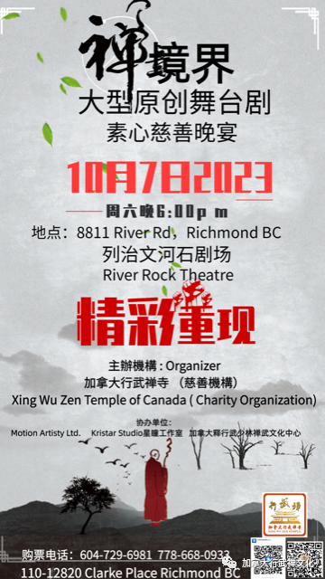 今年,在10月7日晚上,素心慈善晚宴,和《禪境界》舞台劇將繼續在列治文的河石劇場隆重的舉行。這是一場非常有意義的慈善素食晚宴,通過以舞台劇的表演形式,來傳播弘揚華夏傳統文化,同時也是為,加拿大行武禪寺籌建,募資善款。