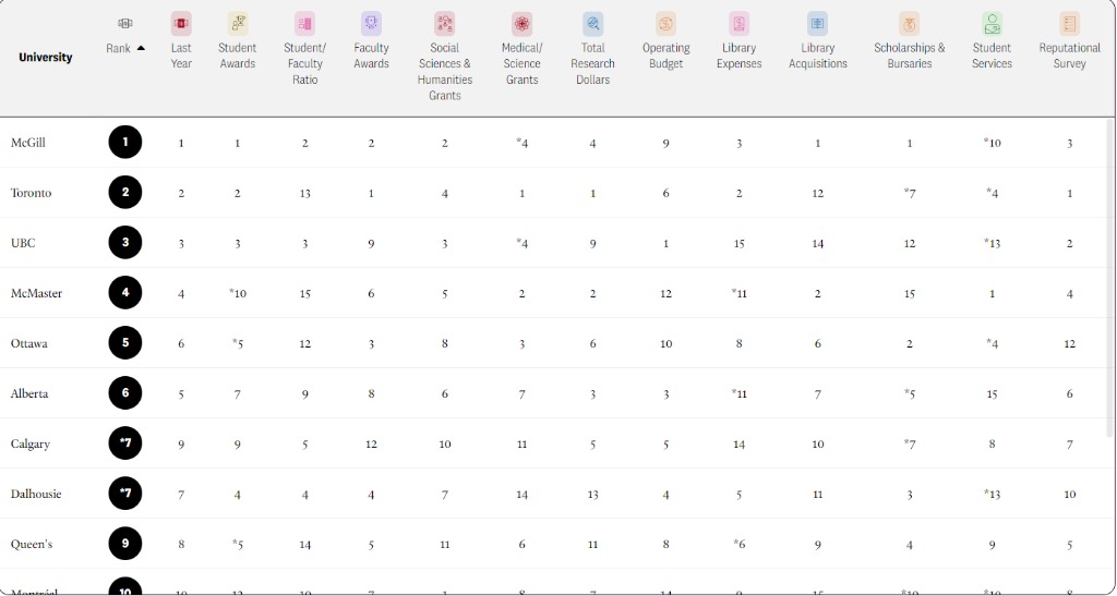 具體榜單請瀏覽:https://education.macleans.ca/