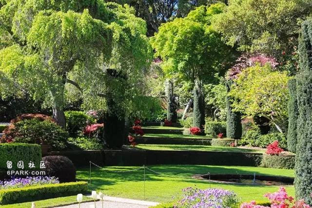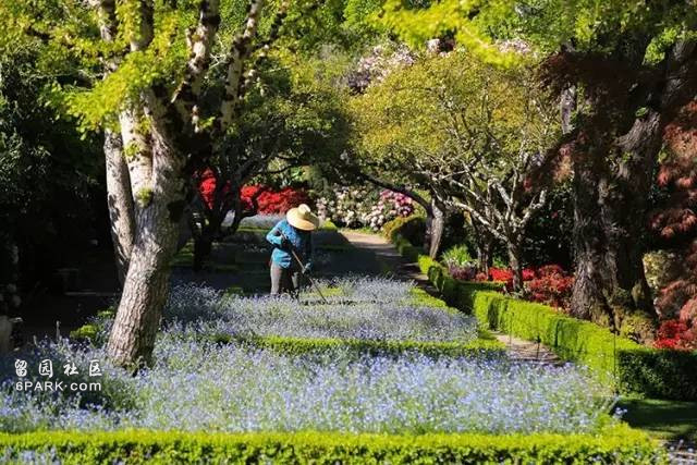工作人員正在清理花園中的枯葉,下方淡藍色的花朵是 “勿忘我” ,貌似米國人民對這種花特別喜愛,很多地方都能看到。