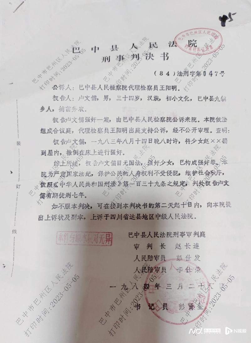 在這份宣判時間為1984年3月28日的《巴中縣人民法院刑事判決書》顯示:“經過不公開審理,查明:被告盧某儒,一九八三年八月十四日晚八時許,將少女趙某某騙到屋內,推倒在床上進行強奸。”