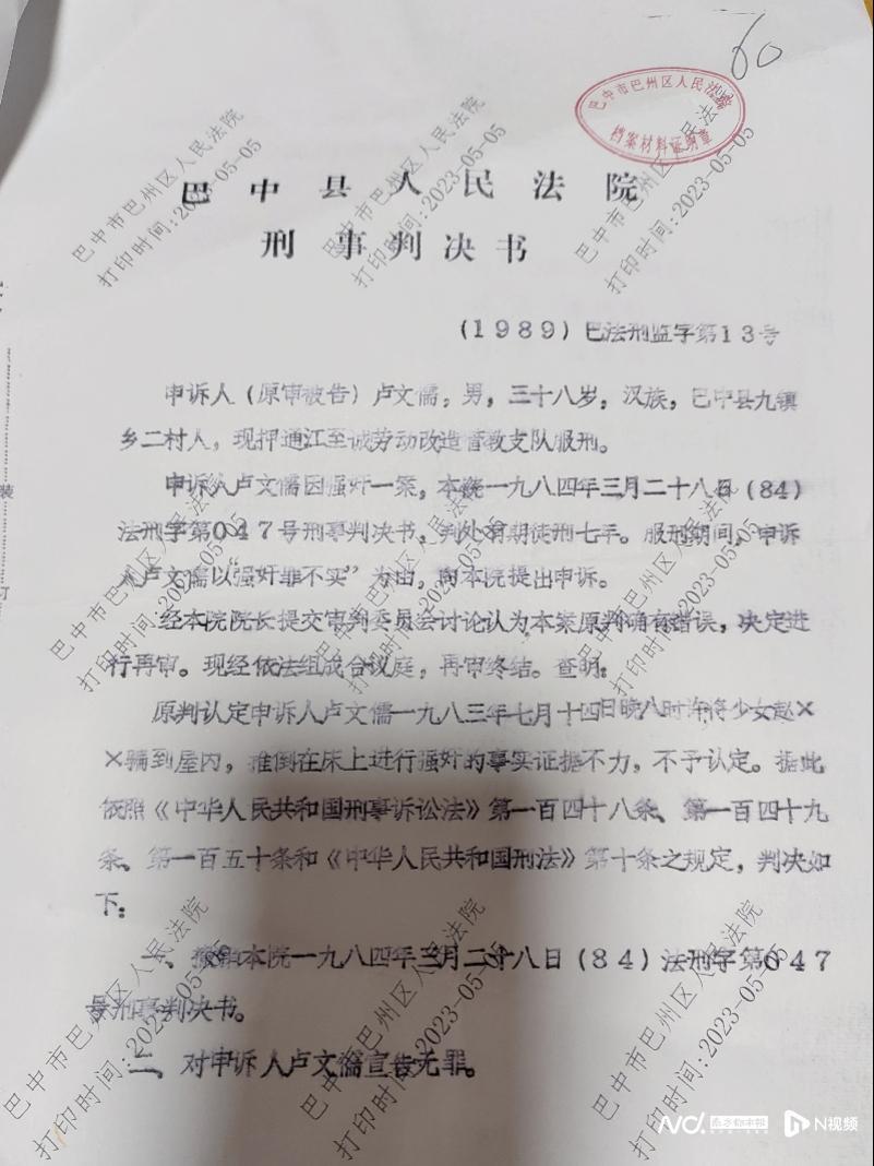 1989年11月22日,原巴中縣人民法院再審判決,認為原判“事實證據不力”,對盧文儒宣告無罪。