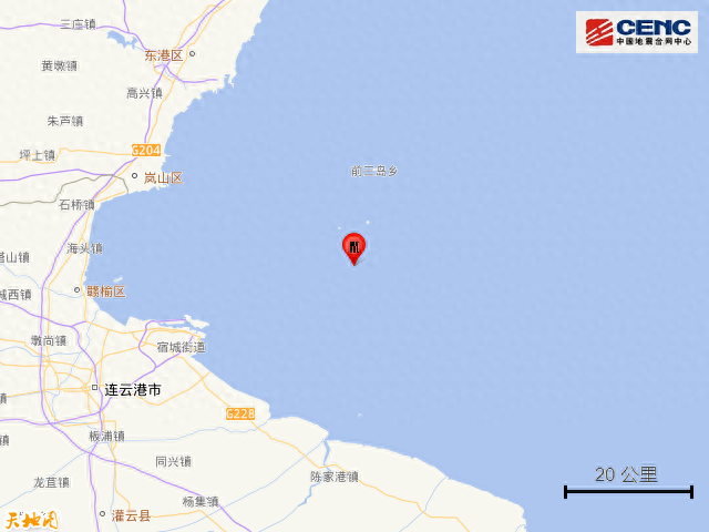 中國地震台網正式測定,12月7日23時1分在江蘇連雲港市贛榆區海域發生3.8級地震,震源深度8公裡,震中位於北緯34.90度,東經119.86度,距海岸線最近約39公裡。