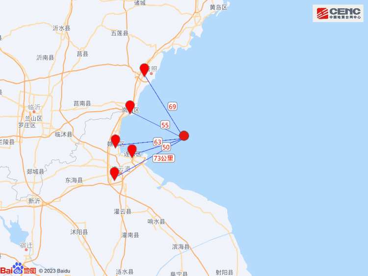 震中距連雲區50公裡、距山東日照市65公裡,距濟南市323公裡。