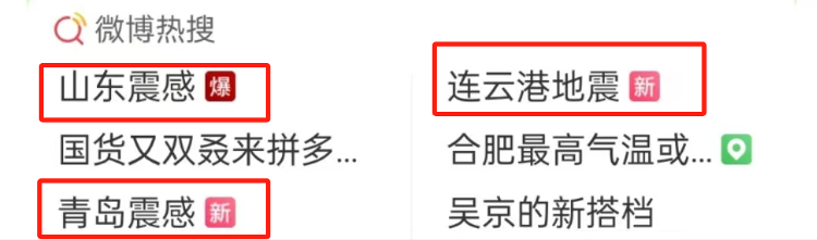 地震發生後,“連雲港地震”的消息沖上熱搜,不少連雲港網友反映稱感到“床在晃”。此外,“山東震感”成為熱搜爆詞。