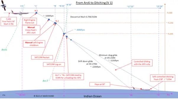 马尔尚和布莱利的新研究,利用第六弧线和第七弧线计算出MH370最后阶段的飞行剖面图。通过假设最好和最坏的情况,可以找到飞机在通过第七弧线后的最远和最近飞行距离。