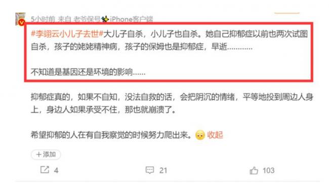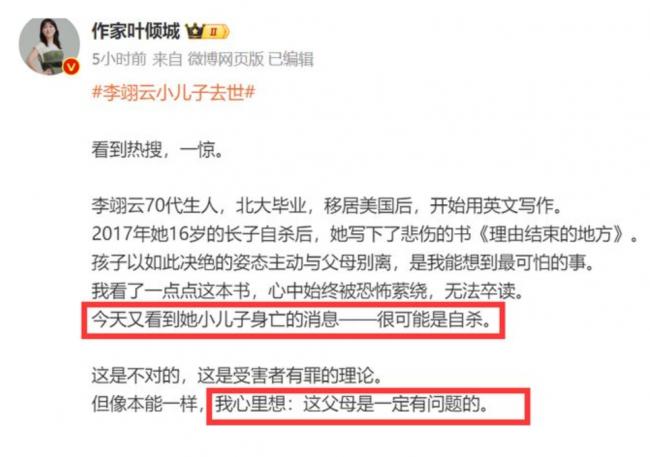 葉傾城表示2017年,李翊雲16歲長子以十分決絕的姿態主動與父母別離,如今小兒子也可能是自殺,“父母一定是有問題的”。