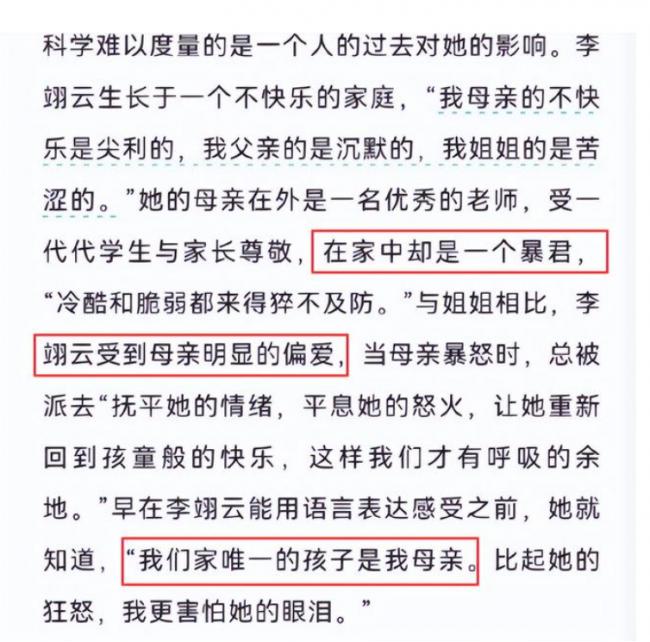 李翊雲也在接受采訪的時候說過:她恨她的母親……母親對她的愛有如一個獨裁者,是控制性的愛,是毫無任何慷慨可言的愛,母親還經常指責她自私。