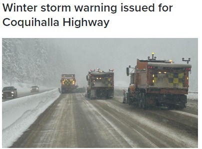 加拿大环境部在警报中表示:本周末穿越 BC 省的风暴系统将为上述路线带来大雪。预计降雪将在夜间加剧,预计周日全天都会有大雪。由于山谷中空气温暖,高速公路的低海拔地区将会下雨。