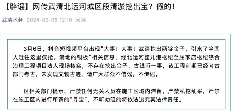 针对此信息,“武清水务”官微3月6日12时许发文辟谣:经北运河筐儿港枢纽至屈家店枢纽综合治理工程项目法人现场核实,不存在挖出金子、古钱币一事,该工程前期已经考古部门考古,未发现文物古迹,请广大群众不信谣,不传谣。
