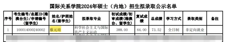 根据北京大学国际关系学院公示信息显示,考生蔡元培的拟录取专业为科学社会主义与国际共产主义运动,其初试、复试总成绩为73.52,排在本专业拟录取考生第一位。考生莫言的拟录取专业为公共管理,其初试、复试总成绩为85.04,排在本专业拟录取考生第二位。