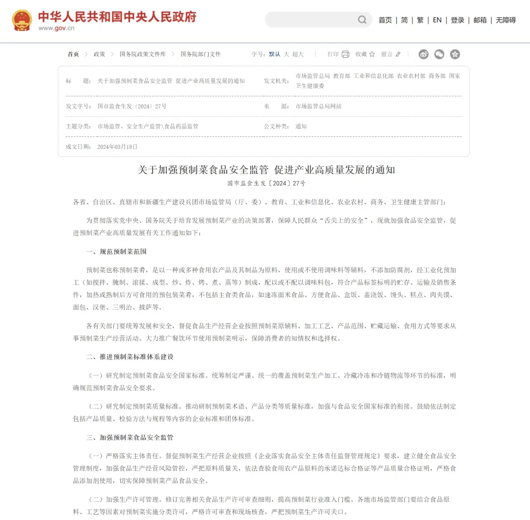 2024年3月18日,市场监管总局、教育部、工业和信息化部、农业农村部、商务部、国家卫生健康委六部门联合印发了《关于加强预制菜食品安全监管 促进产业高质量发展的通知》,“通知”引发了社会各界的广泛关注,餐饮、预制菜企业更是首当其冲需要细细解读并执行的对象。这份“通知”是千呼万唤始出来的纲领性文件,对预制菜的定义、标准体系建设、安全监管以及行业发展提出了重要的原则和机制,这决定了预制菜行业未来的发展方向。