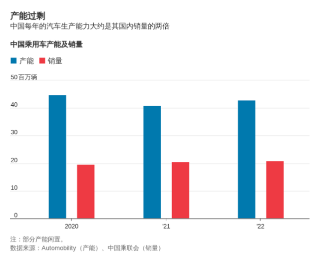 根据上海策略公司Automobility的产能数据和中国乘用车市场信息联席会(简称:乘联会)的销量数据,中国目前每年的汽车产能在4,000万辆左右,但国内销量仅为2,200万辆左右。