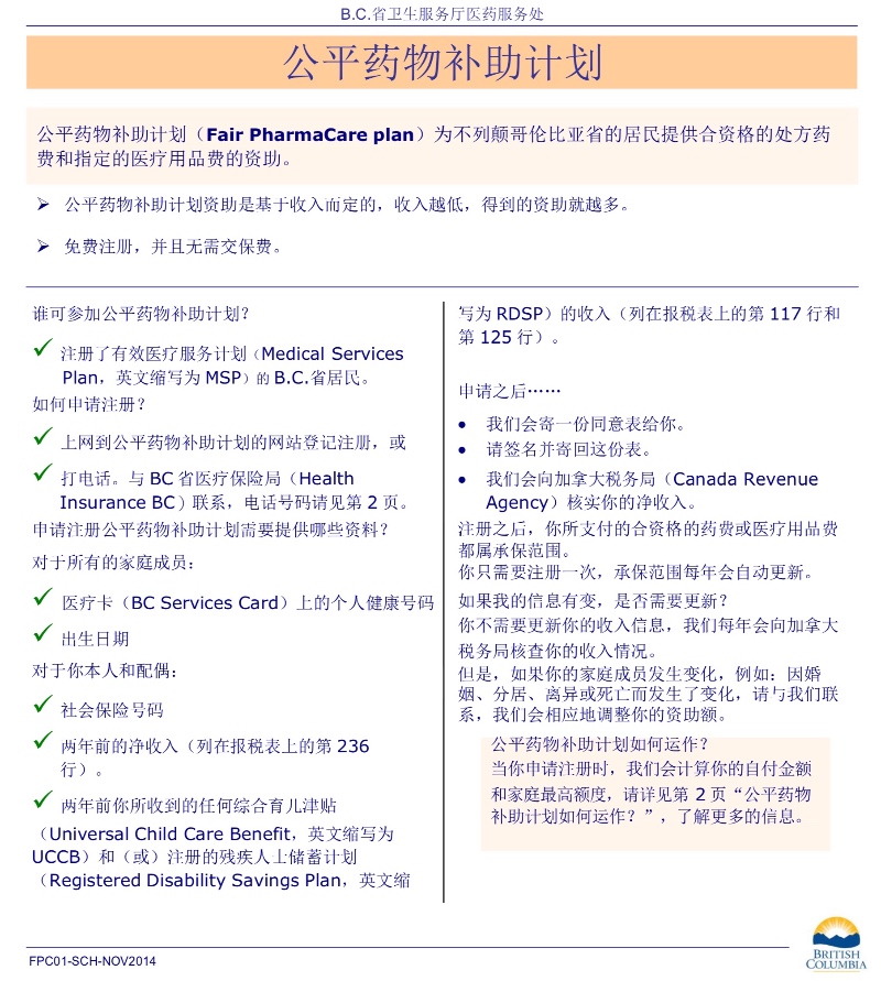 公平药物补助计划为B.C.省居民提供大部份处方药及指定医疗用品的补助
