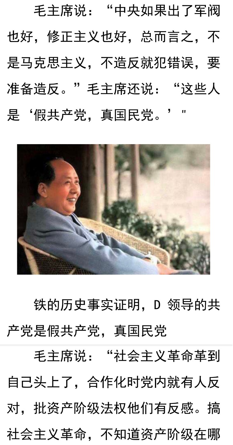故而,否文革、反文革的政治心态,就势必不知不觉地沦为了为当年蒋统国民党的政治立场而站台说话!而无形中沦为了伪共政治、而实乃蒋统国民党的反动反人民的政治意识,而客观性变质变色。这就恰恰客观逻辑性、实践性地印证了毛主席这一科学性英明论断“凡是敌人反对的,我们就要拥护;凡是敌人拥护的,我们就要反对”!否则,其政治思想意识及其立场,就必然逻辑性顺理成章地站队到了中共政治敌对势力的一方。