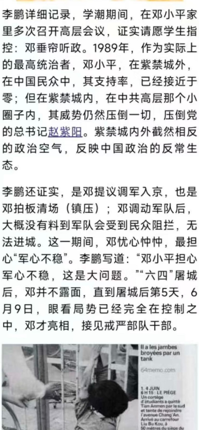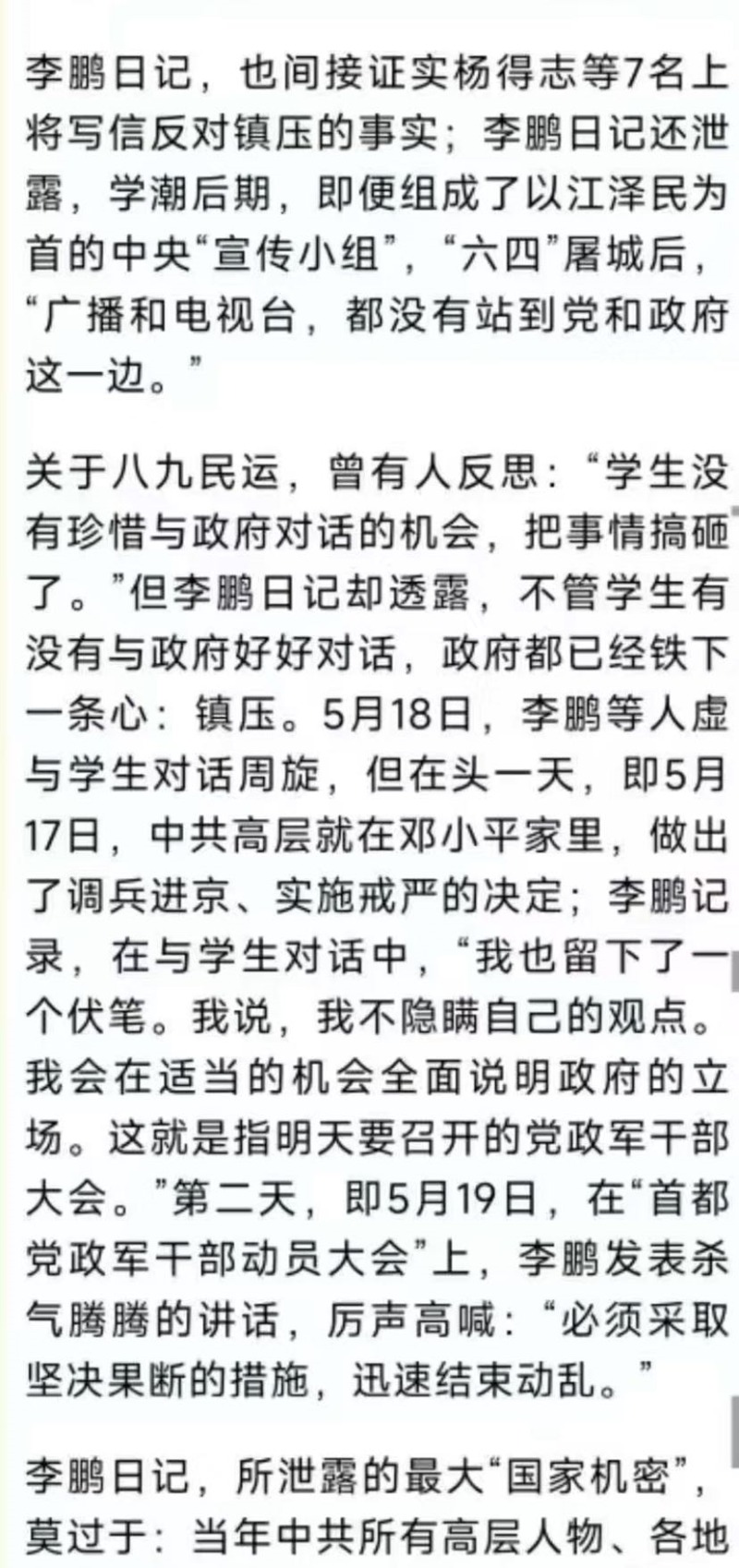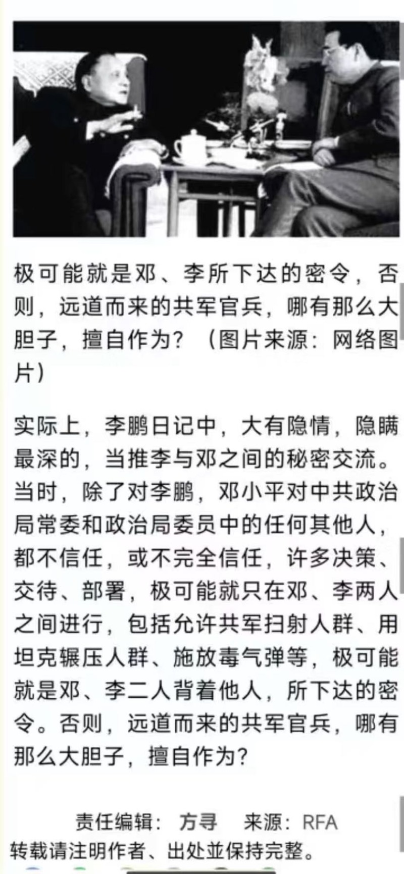 2)既然公诉人称那个命令是所谓“经过中央政治局常委的决定、邓小平主席批准和中央军委下达命令,并由国务院发布命令的.......”话,那么,却为何始终无法发出文字性命令的同时,还暴露除了为何政治局常委决策之前,没有经过政治扩大会议讨论这么和平时期本该法理性必走的民主集中制的政纲程序?这不就透视出该命令之非法而违反法理政纲性质了嘛!
