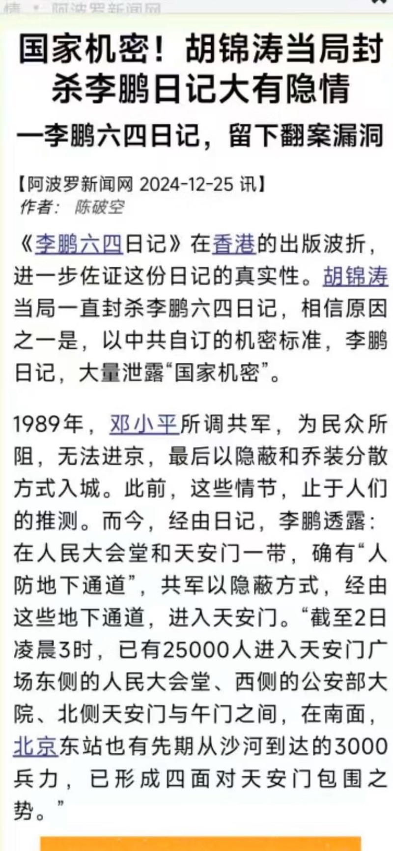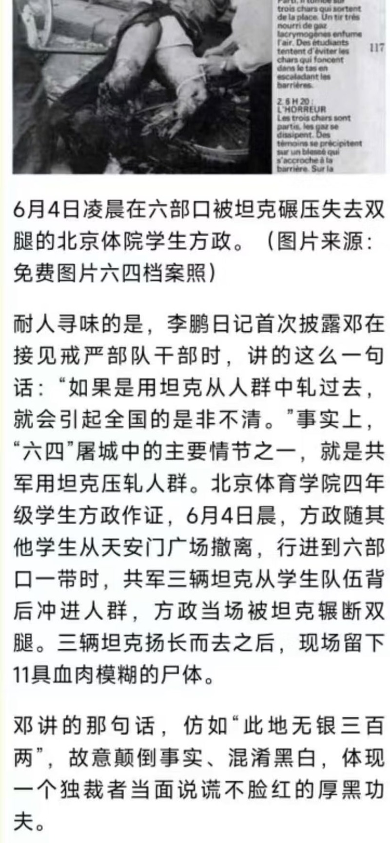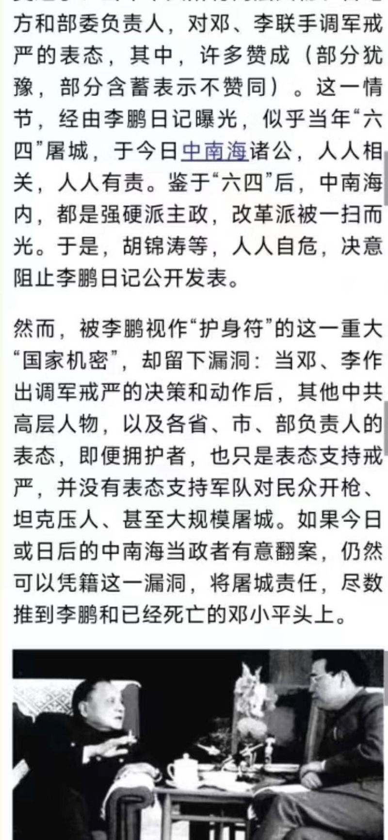 2)既然公诉人称那个命令是所谓“经过中央政治局常委的决定、邓小平主席批准和中央军委下达命令,并由国务院发布命令的.......”话,那么,却为何始终无法发出文字性命令的同时,还暴露除了为何政治局常委决策之前,没有经过政治扩大会议讨论这么和平时期本该法理性必走的民主集中制的政纲程序?这不就透视出该命令之非法而违反法理政纲性质了嘛!