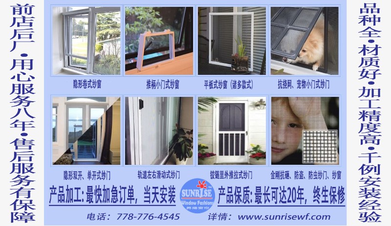 温哥华 纱门纱窗:升阳窗帘隐形纱门大展销,平卷纱、折叠纱、履带式; 《温哥华各式纱门、纱窗大全》