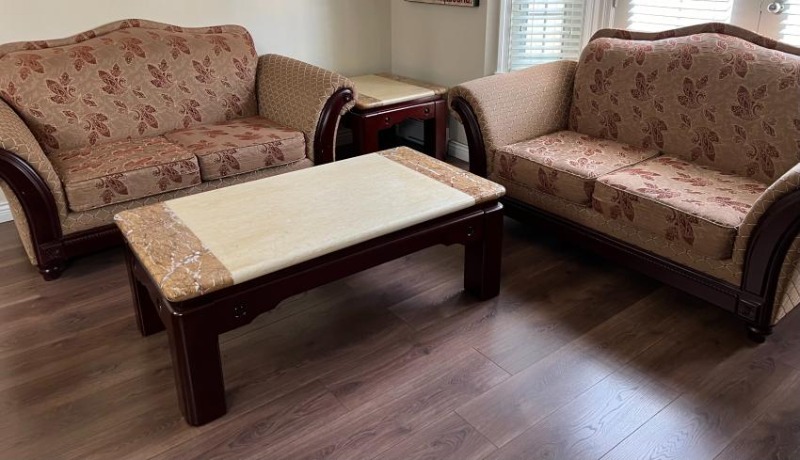 全套高档沙发茶几, 包括两件双人沙发(love seat),一件长茶几,一件边角茶几,实木架,大理石面, 保养好。CAD580.-