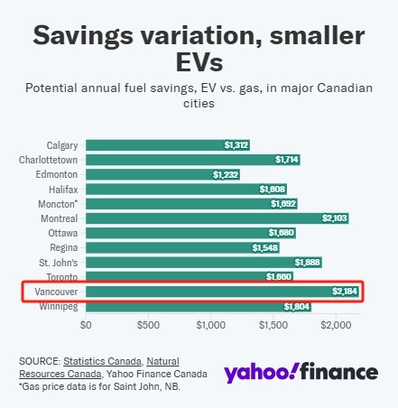 相较燃油车的年度节省额,研究同样假设年行驶里程为2万公里,并采用过去12个月加拿大主要城市的平均油价(数据来自加拿大统计局)。