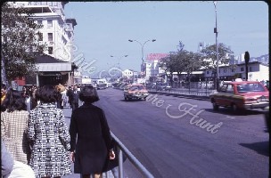 女士们正向弥敦道方向行去, 其左即今日1881 Heritage, 前面是消防局和西青会, 右面是香港文化中心, 国泰广告则是蓝烟囱码头, 即日後的新世界中心和今日的Victoria Dockside。