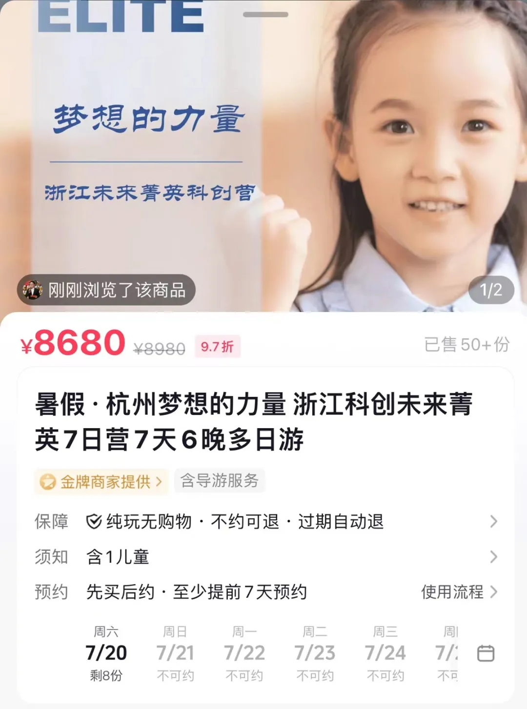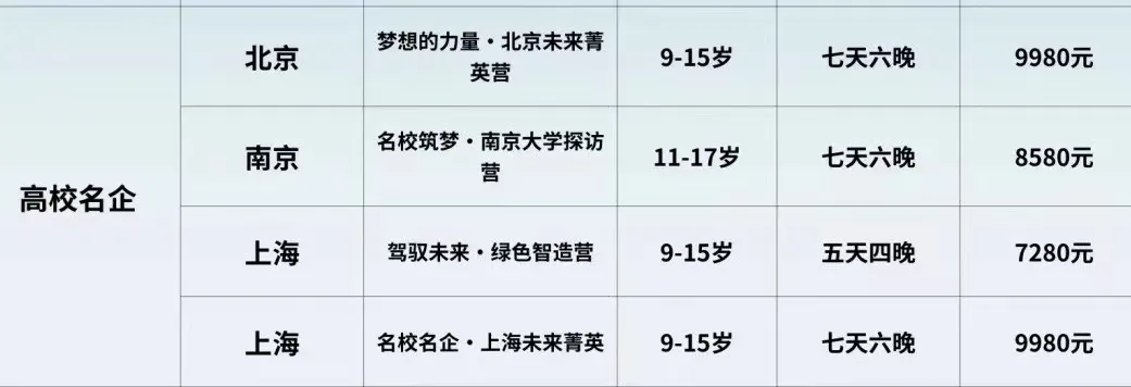 其中,新东方文旅推出的“名校名企·上海未来菁英”“梦想的力量·北京未来菁英”线路价格均为七天六晚9980元,面向9-15岁学生,主要行程包括青少年职业生涯规划课、参观相关企业、参访高校等,其中参观的企业涉及人工智能、新能源与智能汽车、电子信息、金融和高端装备产业等热门产业。