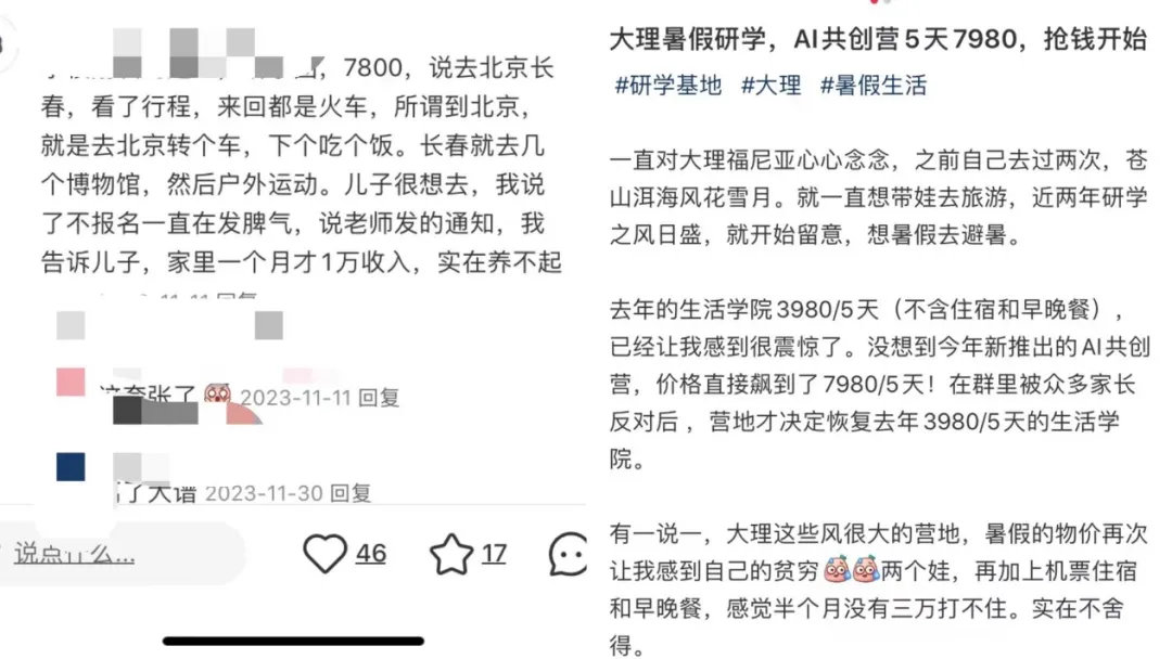 但也有不少家长感受到压力。在小红书上,有家长表示,“研学团7800元,去北京和长春……儿子很想去,我说不报名(儿子)一直发脾气,我告诉儿子,家里一个月才一万收入,实在养不起你。”