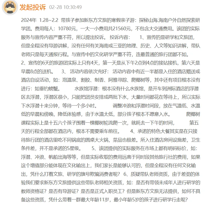 而在黑猫投诉上也有消费者提交相关投诉称自己曾带孩子参加北京新东方文旅的海南研学团,但“宣传的是研学和文旅团,但是全程没有导游讲解,没有任何有关海南或三亚的地理、历史、人文等知识讲解,带队老师只是每天通报行程。