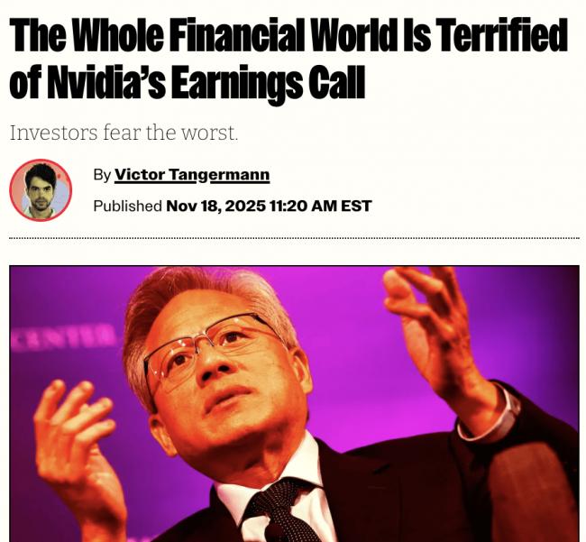 在英偉達財報公布前日,美股市場情緒已出現動搖,在過去一周英偉達蒸發了數百億美元市值,股價五天下跌逾7%,周二單日跌幅超3%。