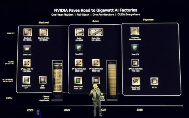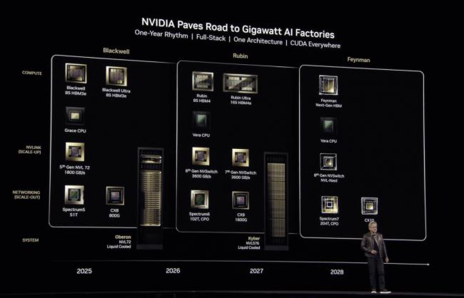 2024-2025年是Blackwell的主場,2026-2027年Rubin就要登場,2028年還有更強大的Feynman。