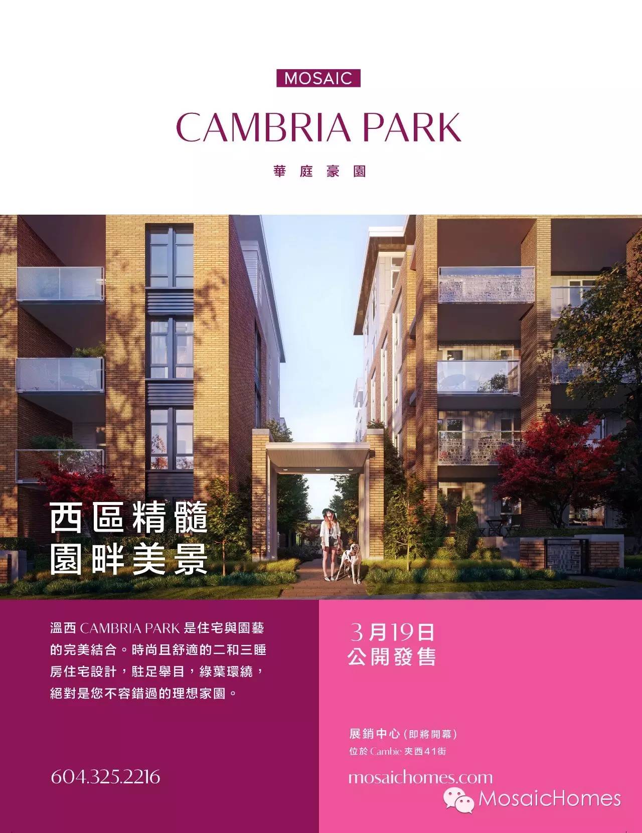 MOSAIC HOMES,作為這最熱門區域著名的地產開發商,沿 Cambie 大街成功興建並售出上百套住宅,廣為人知。如今最新的項目 CAMBRIA PARK,位於溫哥華 Cambie 街與 54th 街,又一次在萬眾期待中拉開帷幕,吸引了無數年輕的,成長中的,以及 Downsizers 家庭的目光。