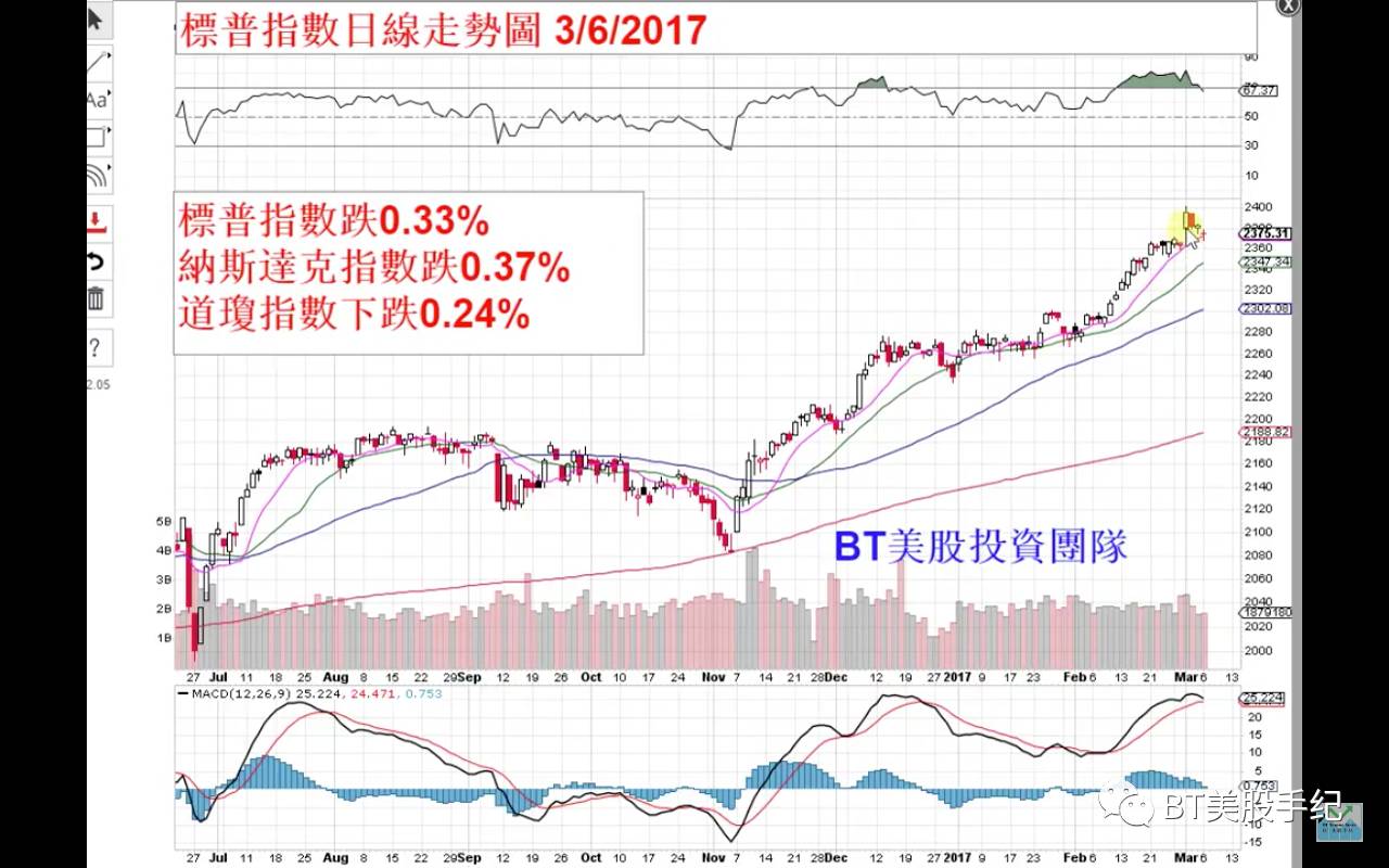 今天是2017年3月6號,星期一。今天美股三大指數全部收跌,截至收盤,標普指數下跌0.33%,報2375.31,道瓊斯指數下跌0.24%,報20954.34,納斯達克指數下跌0.37%,報5849.17。