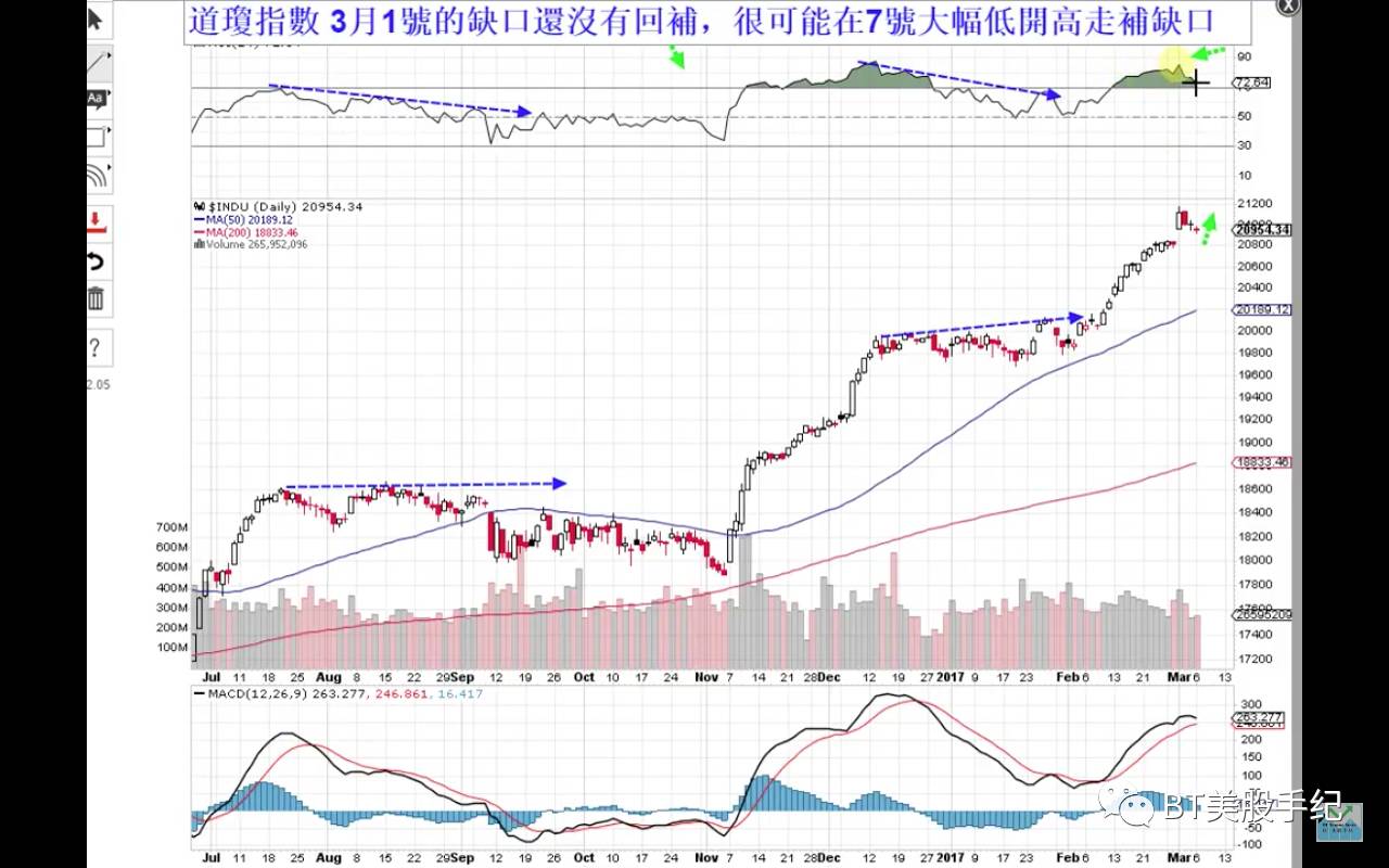 我們先來看一下標普指數和道瓊斯指數的日線圖走勢。今天標普低開低走然後拉升,最終收了一個十字星,盤中一度跌幅達到0.5%,最高時接近平盤。標普指數和納斯達克指數基本回補了3月1號的跳空高開缺口,但是道瓊斯指數依然沒有回補缺口,離缺口大概還有100點的樣子。明天很可能以低開高走的形式來回補這個缺口,但由於道指一般不會出現這麼大的缺口,所以明天也可能是平開低走去回補下方的缺口。這兩種可能性都是有的。即使回補缺口,短線來說,我們依然看好道指向上走出新高。相比2016年7-9月的走勢,目前道指日線的RSI並沒有出現頂背離。