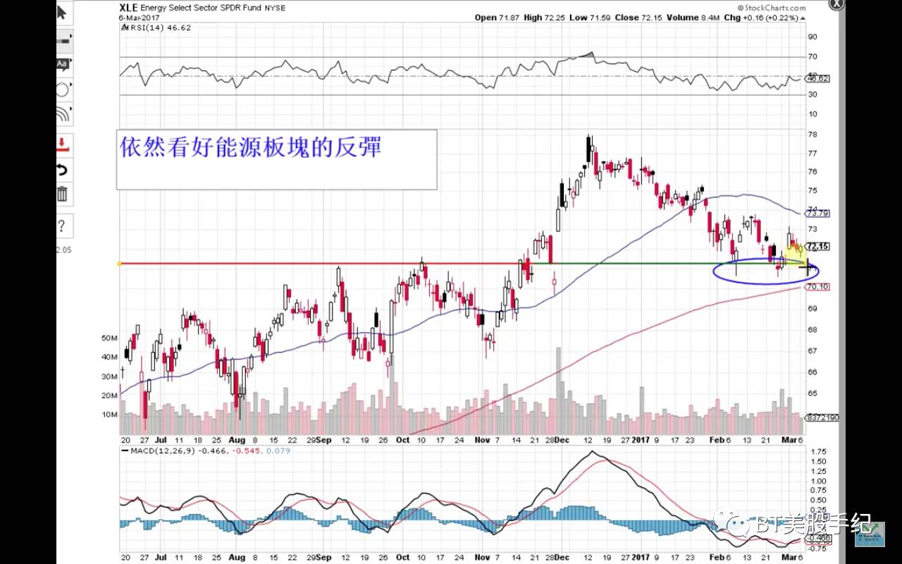 在大盤沒有大幅向下的動力的情況下,我們依然看好能源板塊的走勢。藍色圓圈內我們認為是買進的位置,這裡是接近200均線的地方,同時也是前期盤整的壓力區間。如果僅僅看日線的話,是有小幅跌破支撐的,但這並不意味著就真正跌破了,這個支撐區域還是蠻強的。這附近應該就是底部,但是底部並不意味著一天就能上去。今天收了一根陽線,並且回補了左邊的缺口,這樣向上的趨勢就更加明顯了。目前的位置應該是逢低買進。