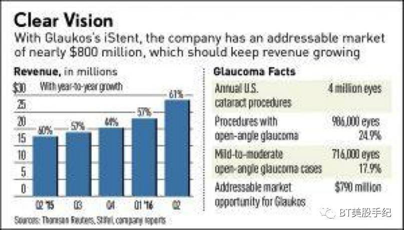 在剛剛過去的2016年第四季度季報中,Glaukos的收入增長64%,達到3300萬美金,比較去年同期的虧損7分,本期保持了盈虧平衡。下個季度預期開始盈利。