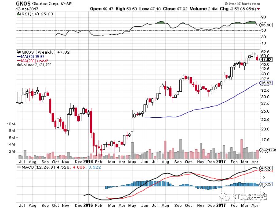 Glaukos在2015年6月上市以來,股價從$17漲到了目前$48左右。這支股因為它技術上的獨到性,比較受華爾街的追捧,但盈利能力需要進一步的加強,估值較高,PE 400+。2017年最大的股價推動力在於被Medicare納入報銷范圍。因為它是可以替代價格昂貴的眼藥水,因此被納入的可能性很高。長期上,這個植入性技術會被越來越多的患者認可。目前很多中國患者選擇去日本,花費2萬人民幣做這個手術。中國龐大的人口基數,中國市場會是他們以後重點開發的對象。