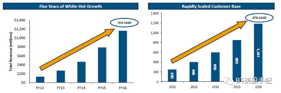 看上圖,回顧過去四年,公司就已經從1億美金跨入了10億美金的銷售額(年均增長率71%),更主要的是,公司目前已經是四大SaaS系統服務運營商之一了,其中有超過10億美金的收入是穩定的老客戶提供的。