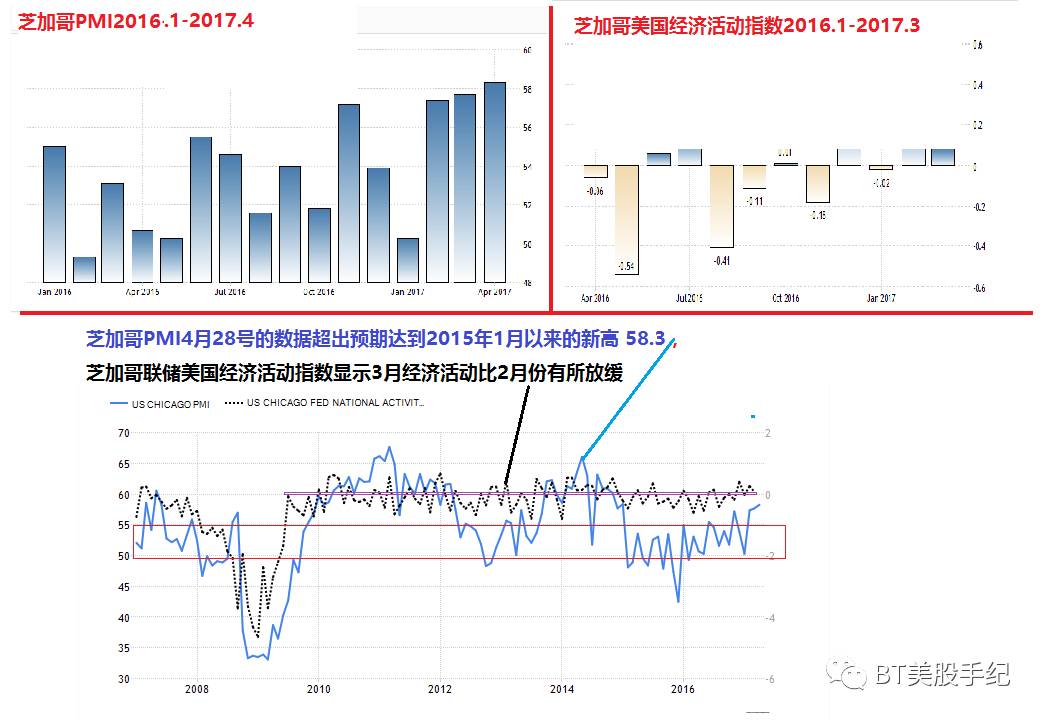 四月份的經濟數據我們可以看到不少亮點,上周達拉斯和裡士滿的制造業數據達到或超過預期,芝加哥PMI表現強勁超出預期達到2015年1月以來的最高點58.3,而且是連續三個月保持在高位。芝加哥聯儲的三月份全國經濟活動指數顯示全國經濟增長在三月份弱於年初1-2月份,但整體一季度明顯要強於過去一兩年的整體情況。