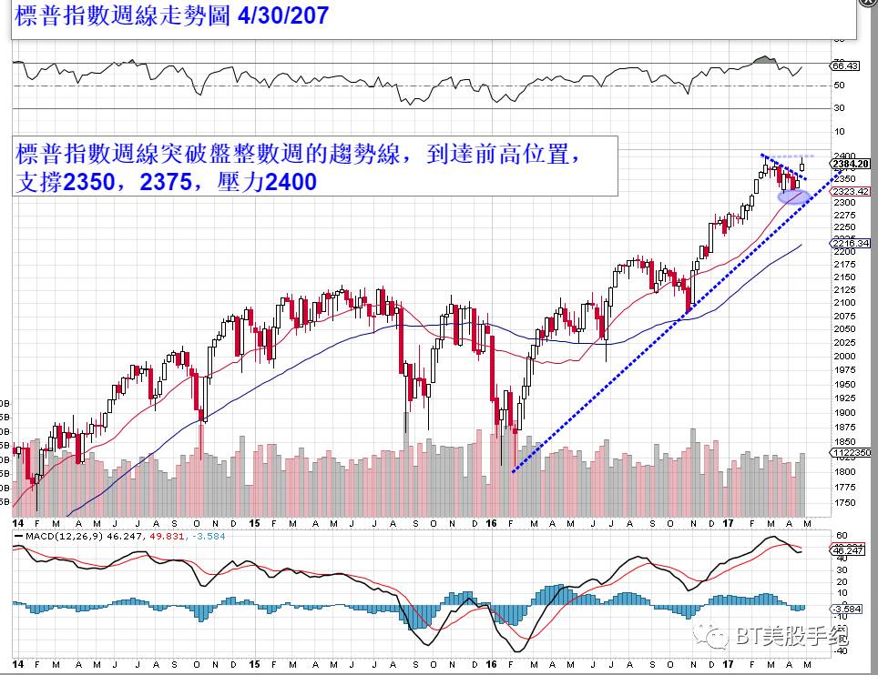 從技術走勢來看,標普指數走出了一個高位盤整很牛的牛期,上周向上突破需要本周確認,而支撐點正好在20日均線附近,所以我們看好整體大盤中短線的走勢,如果本周初突破2400那麼下個目標就是2500