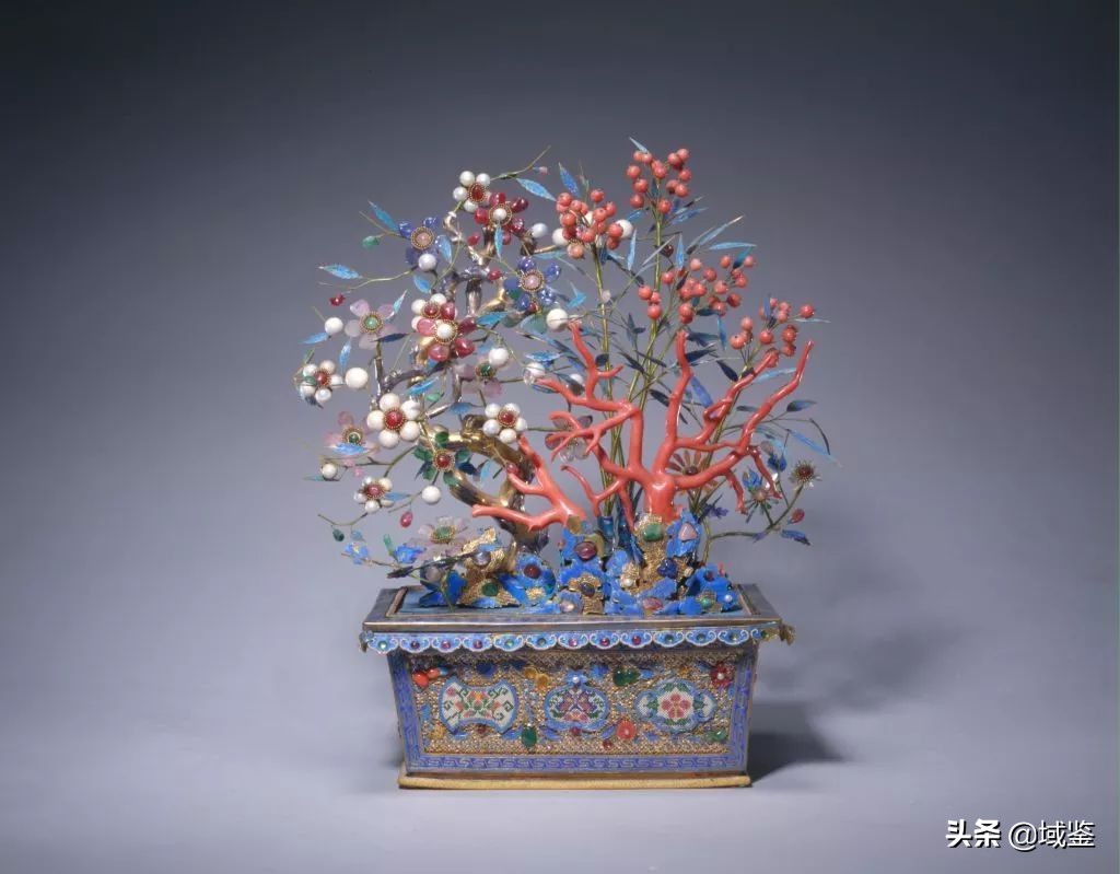 此盆景镂金错玉,穿珠垒银,遍铺宝石,特别是一树梅花珠光宝气,共用大珍珠64颗,红蓝宝石216粒,精雕细作,鬼斧神工,令人目眩。